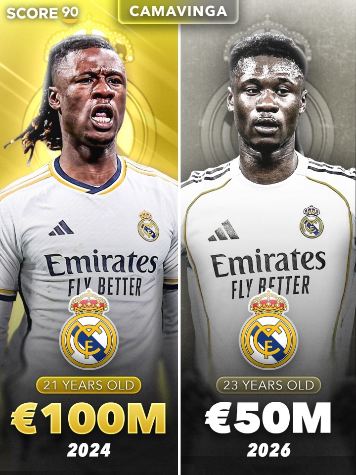 卡馬文加:21歲 1億歐→23歲 5000萬歐