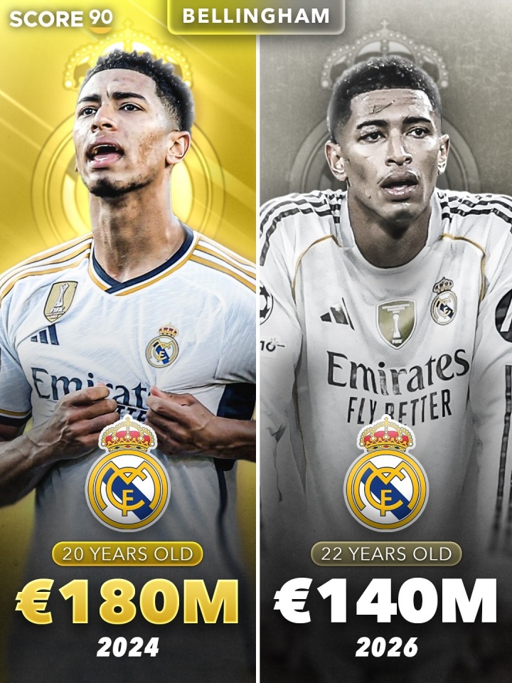 貝林厄姆:20歲 1.8億歐 →22歲 1.4億歐