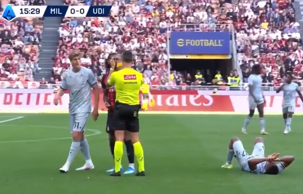 04月12日訊 本輪意甲AC米蘭主場0-3慘敗于烏迪內斯,上半場比賽發(fā)生了人啼笑皆非的一幕。比賽第16分鐘,萊奧進攻中對抗與對手雙雙倒地,主裁判判罰萊奧手臂打臉犯規(guī),將球吹給烏迪內斯。萊奧對這一判罰表示不理解,坐在地上向裁判鼓掌,當他起身時,主裁判馬泰奧·馬爾凱蒂直接向其掏出黃牌,并同樣以鼓掌回應。
