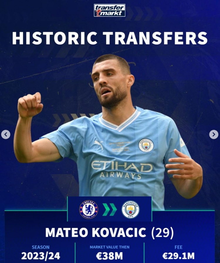 科瓦西奇(29歲):切爾西→曼城,23-24賽季,身價(jià)3800萬,轉(zhuǎn)會費(fèi)2910萬